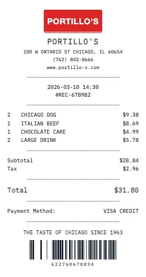 Need a Portillo's restaurant receipt? Our generator creates authentic dining receipts complete with itemized food and beverage orders, server name, table number, tip line, and gratuity calculations. Whether you're documenting a business dinner or replacing a faded receipt, ProReceiptMaker delivers the most realistic Portillo's receipt available online.