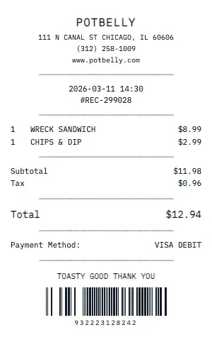 Need a Potbelly restaurant receipt? Our generator creates authentic dining receipts complete with itemized food and beverage orders, server name, table number, tip line, and gratuity calculations. Whether you're documenting a business dinner or replacing a faded receipt, ProReceiptMaker delivers the most realistic Potbelly receipt available online.