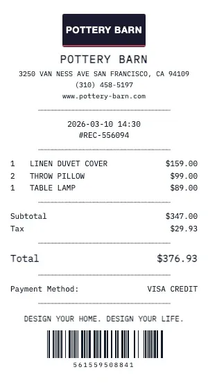 Whether you need a Pottery Barn receipt for a warranty claim, return authorization, price adjustment, or expense documentation, our generator creates receipts that look exactly like the real thing. Customize store number, register number, transaction ID, and barcode.