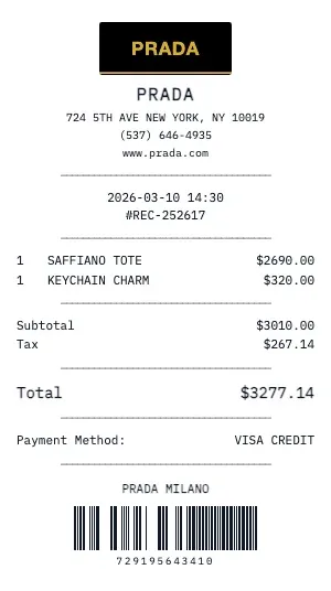 Whether you need a Prada receipt for insurance appraisal, resale authentication, gift documentation, or personal collection records, our generator produces receipts with the attention to detail that luxury brands are known for. Add care instructions, warranty terms, and boutique contact information.