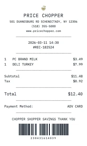 Building a price comparison database? Generate standardized Price Chopper receipts to track and compare product prices across stores, dates, and promotions.