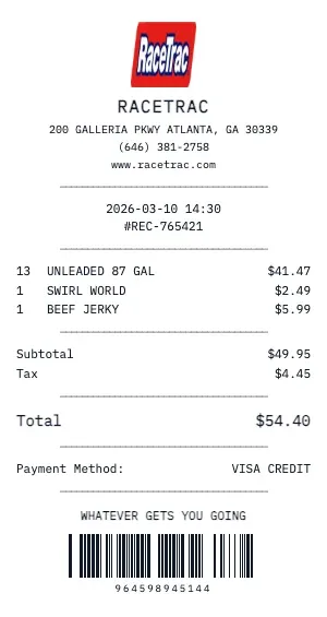 RaceTrac gas receipts from our tool feature the specific formatting used by fuel station POS systems: transaction ID, pump authorization number, fuel type selection, volume dispensed, unit price, and payment method. You can add inside purchases (snacks, drinks, lottery) as separate line items.