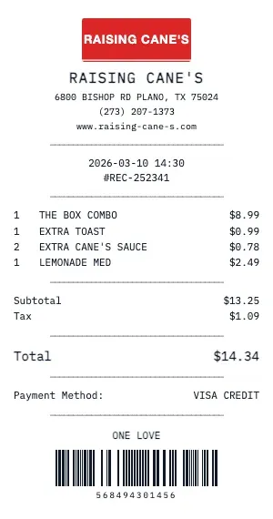 Need a Raising Cane's restaurant receipt? Our generator creates authentic dining receipts complete with itemized food and beverage orders, server name, table number, tip line, and gratuity calculations. Whether you're documenting a business dinner or replacing a faded receipt, ProReceiptMaker delivers the most realistic Raising Cane's receipt available online.