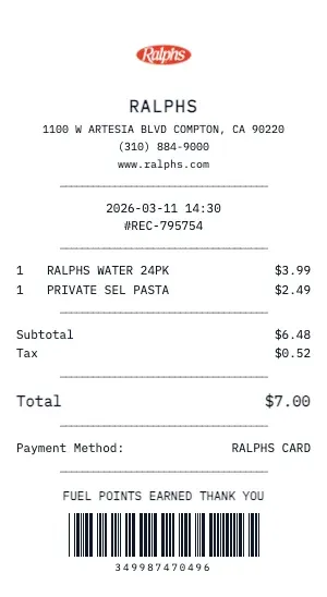 Building a price comparison database? Generate standardized Ralphs receipts to track and compare product prices across stores, dates, and promotions.