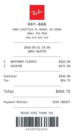 Whether you need a Ray-Ban receipt for insurance appraisal, resale authentication, gift documentation, or personal collection records, our generator produces receipts with the attention to detail that luxury brands are known for. Add care instructions, warranty terms, and boutique contact information.
