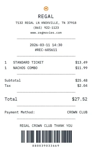 Whether you need a Regal receipt for a warranty claim, return authorization, price adjustment, or expense documentation, our generator creates receipts that look exactly like the real thing. Customize store number, register number, transaction ID, and barcode.