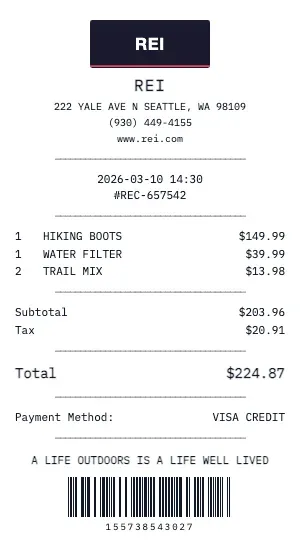 Create a professional REI retail receipt with our free generator. Our retail receipt format includes item descriptions, SKU/UPC numbers, sizing information, color variants, original vs. sale pricing, and return policy details — matching the format of major retail POS systems.