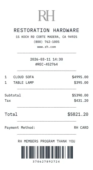 Whether you need a Restoration Hardware receipt for a warranty claim, return authorization, price adjustment, or expense documentation, our generator creates receipts that look exactly like the real thing. Customize store number, register number, transaction ID, and barcode.