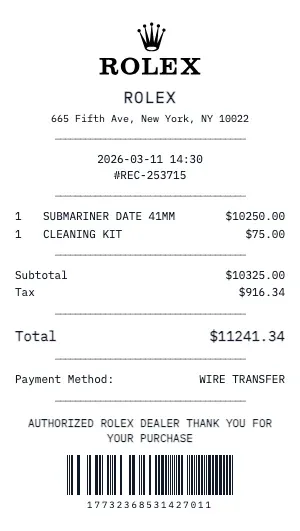 Whether you need a Rolex receipt for insurance appraisal, resale authentication, gift documentation, or personal collection records, our generator produces receipts with the attention to detail that luxury brands are known for. Add care instructions, warranty terms, and boutique contact information.
