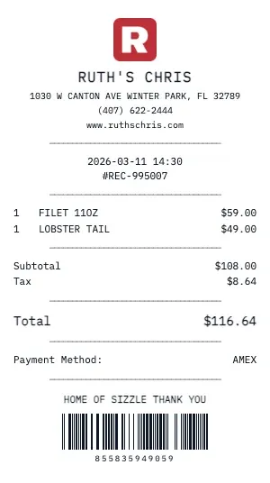 Every Ruth's Chris receipt from our tool includes the details diners expect — appetizers, entrées, drinks, desserts, subtotal, tax, tip amount, and total. You can customize the server name, table number, and even add a "Thank You" footer message. Our restaurant receipt format matches what real POS systems like Toast, Square, and Clover produce.