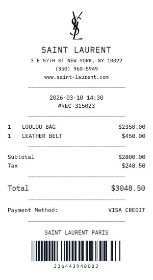 Whether you need a Saint Laurent receipt for insurance appraisal, resale authentication, gift documentation, or personal collection records, our generator produces receipts with the attention to detail that luxury brands are known for. Add care instructions, warranty terms, and boutique contact information.