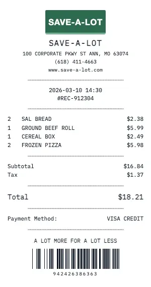 Building a price comparison database? Generate standardized Save-A-Lot receipts to track and compare product prices across stores, dates, and promotions.