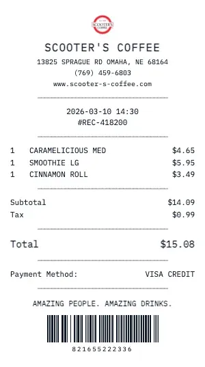 The Scooter's Coffee coffee receipt template handles complex drink builds: base drink, size (Tall/Grande/Venti or S/M/L), milk type (Whole, Oat, Almond, Soy), extra shots, syrup pumps, whipped cream, and custom modifications. Each customization can be individually priced.
