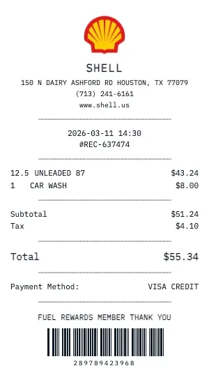 Create a realistic Shell gas station receipt for fuel purchases, car washes, or convenience store items. Our generator includes pump number, fuel grade (Regular, Plus, Premium, Diesel), gallons dispensed, price per gallon, and total cost — exactly like a real fuel receipt.