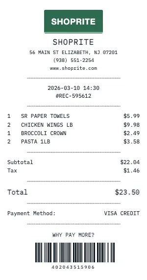 Generate a realistic ShopRite grocery receipt with our free tool. Our grocery receipt format includes department codes, item SKUs, weight-based pricing for produce and deli, coupon discounts, loyalty card savings, and the classic "YOU SAVED $X.XX" summary line that real grocery receipts feature.