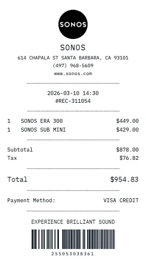 Our Sonos template handles electronics-specific transactions: trade-in credit applied, carrier activation fees, monthly installment plan details, screen protector and case add-ons, and recycling fee charges. The perfect tool for documenting tech purchases and protecting your investment.