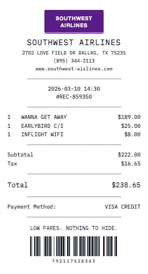 Whether you need a Southwest Airlines receipt for a warranty claim, return authorization, price adjustment, or expense documentation, our generator creates receipts that look exactly like the real thing. Customize store number, register number, transaction ID, and barcode.