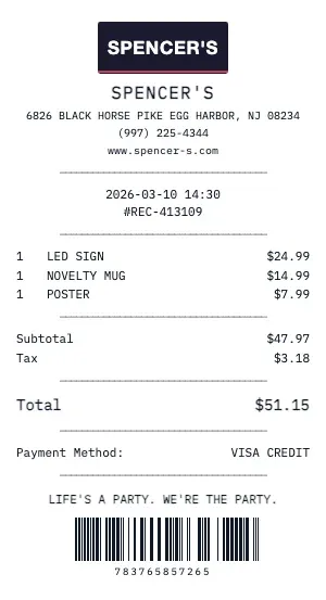Whether you need a Spencer's receipt for a warranty claim, return authorization, price adjustment, or expense documentation, our generator creates receipts that look exactly like the real thing. Customize store number, register number, transaction ID, and barcode.