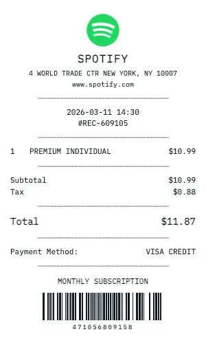 Whether you need a Spotify receipt for a warranty claim, return authorization, price adjustment, or expense documentation, our generator creates receipts that look exactly like the real thing. Customize store number, register number, transaction ID, and barcode.