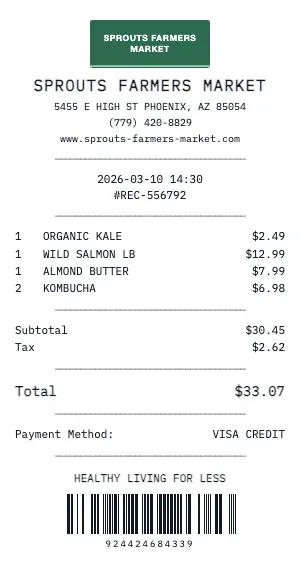 Generate a realistic Sprouts Farmers Market grocery receipt with our free tool. Our grocery receipt format includes department codes, item SKUs, weight-based pricing for produce and deli, coupon discounts, loyalty card savings, and the classic "YOU SAVED $X.XX" summary line that real grocery receipts feature.