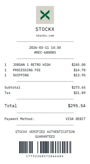 Create a professional StockX retail receipt with our free generator. Our retail receipt format includes item descriptions, SKU/UPC numbers, sizing information, color variants, original vs. sale pricing, and return policy details — matching the format of major retail POS systems.