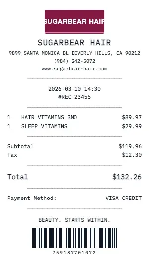 Our SugarBear Hair template supports beauty-specific details: shade matching notes, skin type recommendations, ingredient allergy flags, subscription box credits, and employee discount indicators. Create receipts that look exactly like the real in-store printouts.