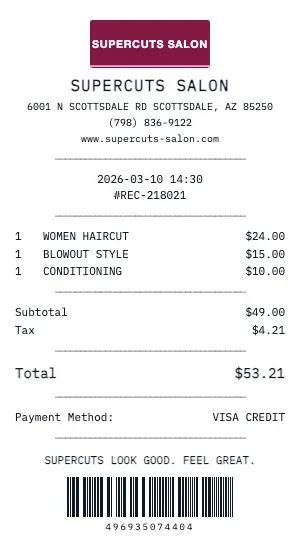 Our Supercuts Salon template supports beauty-specific details: shade matching notes, skin type recommendations, ingredient allergy flags, subscription box credits, and employee discount indicators. Create receipts that look exactly like the real in-store printouts.