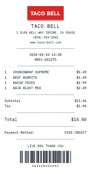 Every detail matters. Here\u2019s what a genuine Taco Bell receipt includes \u2014 and how our generator replicates each element.