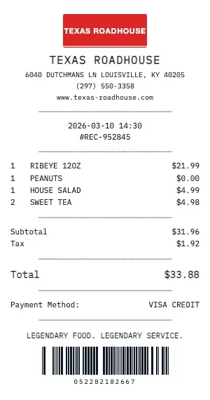 Every Texas Roadhouse receipt from our tool includes the details diners expect — appetizers, entrées, drinks, desserts, subtotal, tax, tip amount, and total. You can customize the server name, table number, and even add a "Thank You" footer message. Our restaurant receipt format matches what real POS systems like Toast, Square, and Clover produce.