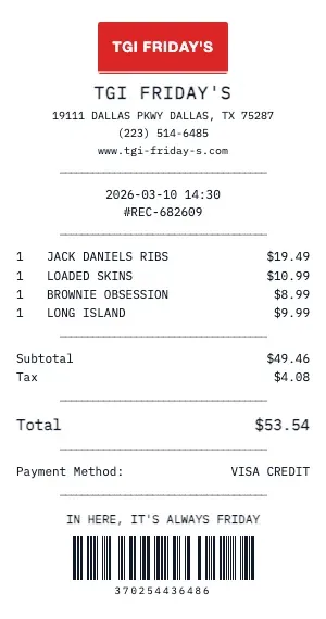 Need a TGI Friday's restaurant receipt? Our generator creates authentic dining receipts complete with itemized food and beverage orders, server name, table number, tip line, and gratuity calculations. Whether you're documenting a business dinner or replacing a faded receipt, ProReceiptMaker delivers the most realistic TGI Friday's receipt available online.