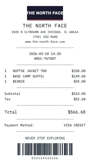 Whether you need a The North Face receipt for a warranty claim, return authorization, price adjustment, or expense documentation, our generator creates receipts that look exactly like the real thing. Customize store number, register number, transaction ID, and barcode.