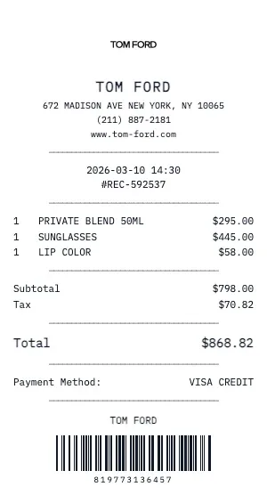 Whether you need a Tom Ford receipt for insurance appraisal, resale authentication, gift documentation, or personal collection records, our generator produces receipts with the attention to detail that luxury brands are known for. Add care instructions, warranty terms, and boutique contact information.