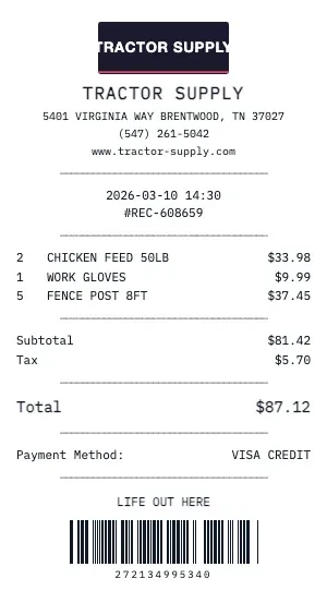 Whether you need a Tractor Supply receipt for a warranty claim, return authorization, price adjustment, or expense documentation, our generator creates receipts that look exactly like the real thing. Customize store number, register number, transaction ID, and barcode.