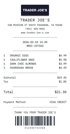 Whether you need a Trader Joe's receipt for a warranty claim, return authorization, price adjustment, or expense documentation, our generator creates receipts that look exactly like the real thing. Customize store number, register number, transaction ID, and barcode.