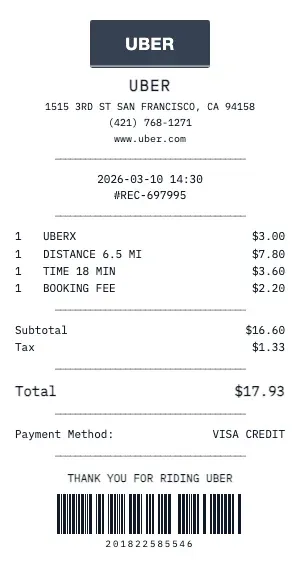 Whether you need a Uber receipt for a warranty claim, return authorization, price adjustment, or expense documentation, our generator creates receipts that look exactly like the real thing. Customize store number, register number, transaction ID, and barcode.