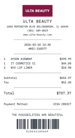 Our Ulta Beauty template supports beauty-specific details: shade matching notes, skin type recommendations, ingredient allergy flags, subscription box credits, and employee discount indicators. Create receipts that look exactly like the real in-store printouts.