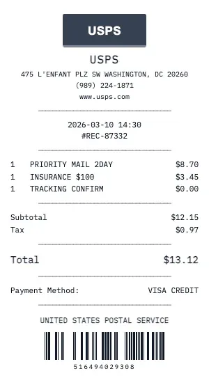 Whether you need a USPS receipt for a warranty claim, return authorization, price adjustment, or expense documentation, our generator creates receipts that look exactly like the real thing. Customize store number, register number, transaction ID, and barcode.