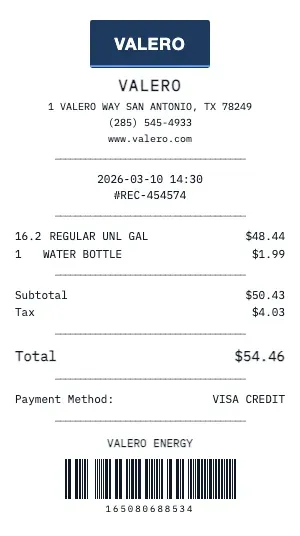 Track fuel costs from Valero for IRS-standard mileage deduction or employer mileage reimbursement programs. Our receipts show gallons, price, and location for audit-ready records.