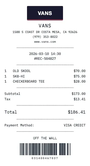 Whether you need a Vans receipt for a warranty claim, return authorization, price adjustment, or expense documentation, our generator creates receipts that look exactly like the real thing. Customize store number, register number, transaction ID, and barcode.