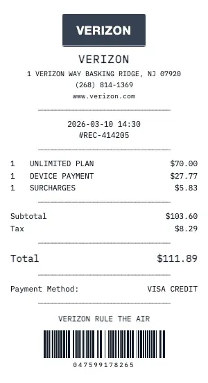 Every detail matters. Here\u2019s what a genuine Verizon receipt includes \u2014 and how our generator replicates each element.