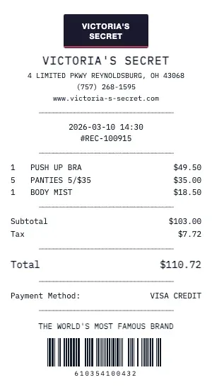 Whether you need a Victoria's Secret receipt for a warranty claim, return authorization, price adjustment, or expense documentation, our generator creates receipts that look exactly like the real thing. Customize store number, register number, transaction ID, and barcode.