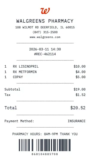 The Walgreens Pharmacy receipt format handles medical-specific billing: CPT codes, ICD-10 diagnosis references, insurance plan payments, patient responsibility amounts, deductible tracking, and payment plan options. Essential for FSA/HSA reimbursement and tax deduction documentation.