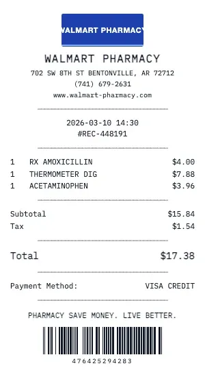 The Walmart Pharmacy receipt format handles medical-specific billing: CPT codes, ICD-10 diagnosis references, insurance plan payments, patient responsibility amounts, deductible tracking, and payment plan options. Essential for FSA/HSA reimbursement and tax deduction documentation.