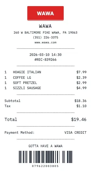 Need a Wawa restaurant receipt? Our generator creates authentic dining receipts complete with itemized food and beverage orders, server name, table number, tip line, and gratuity calculations. Whether you're documenting a business dinner or replacing a faded receipt, ProReceiptMaker delivers the most realistic Wawa receipt available online.