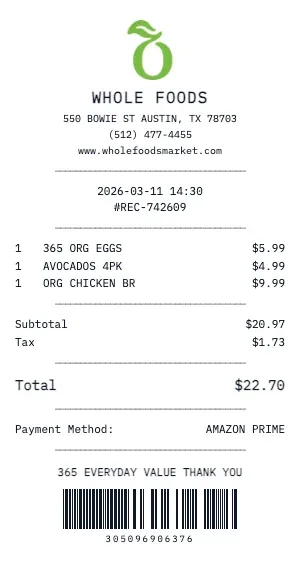 Building a price comparison database? Generate standardized Whole Foods receipts to track and compare product prices across stores, dates, and promotions.