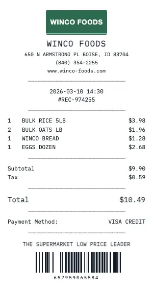 Building a price comparison database? Generate standardized WinCo Foods receipts to track and compare product prices across stores, dates, and promotions.