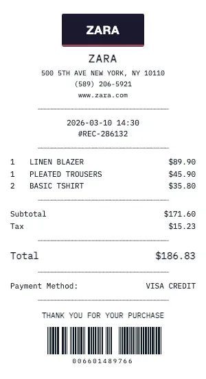 Whether you need a Zara receipt for a warranty claim, return authorization, price adjustment, or expense documentation, our generator creates receipts that look exactly like the real thing. Customize store number, register number, transaction ID, and barcode.